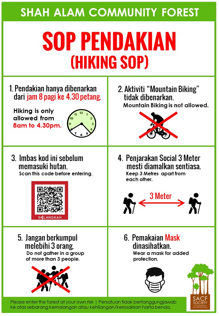 Our Shah Alam Community Forest trails have be open since June 15th 2020! We urge everyone to comply with the SOP given by our government. Please know that SACF can be closed again by the authorities if they found that hikers are not obeying the SOP. So please do your part to keep the trails open. We are counting on you!