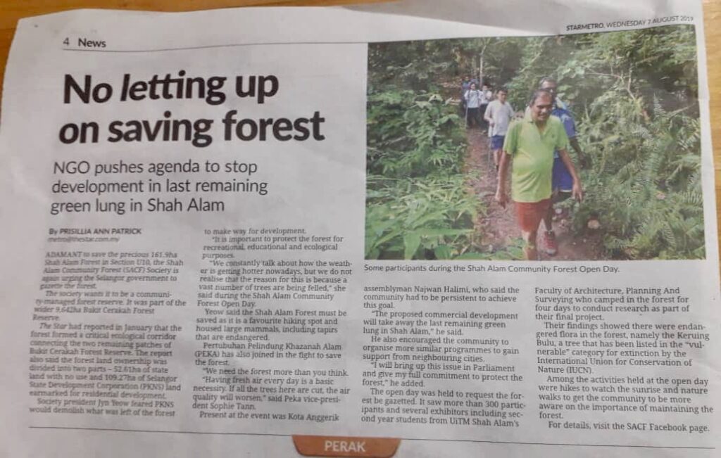 ADAMANT to save the precious 161.9ha Shah Alam Forest in Section U10, the Shah Alam Community Forest (SACF) Society is again urging the Selangor government to gazette the forest. The society wants it to be a community-managed forest reserve. It was part of the wider 9,642ha Bukit Cerakah Forest Reserve.