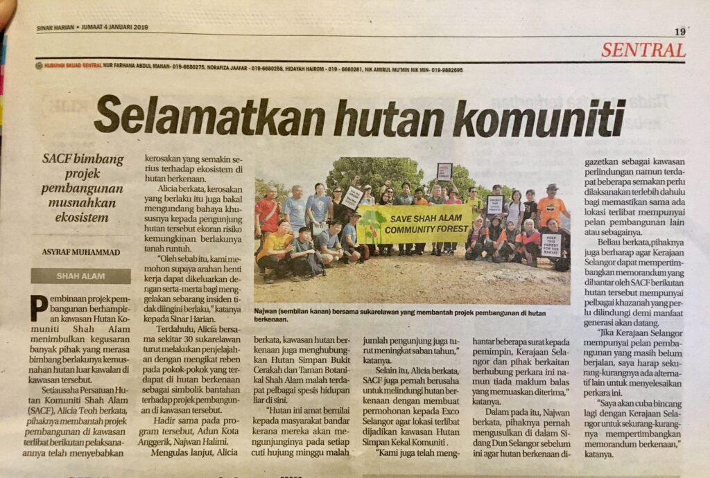 The Shah Alam Community Forest was featured in Malay local daily, Sinar Harian on Jan 4th, 2019 regarding our “Save SACF” campaign.
